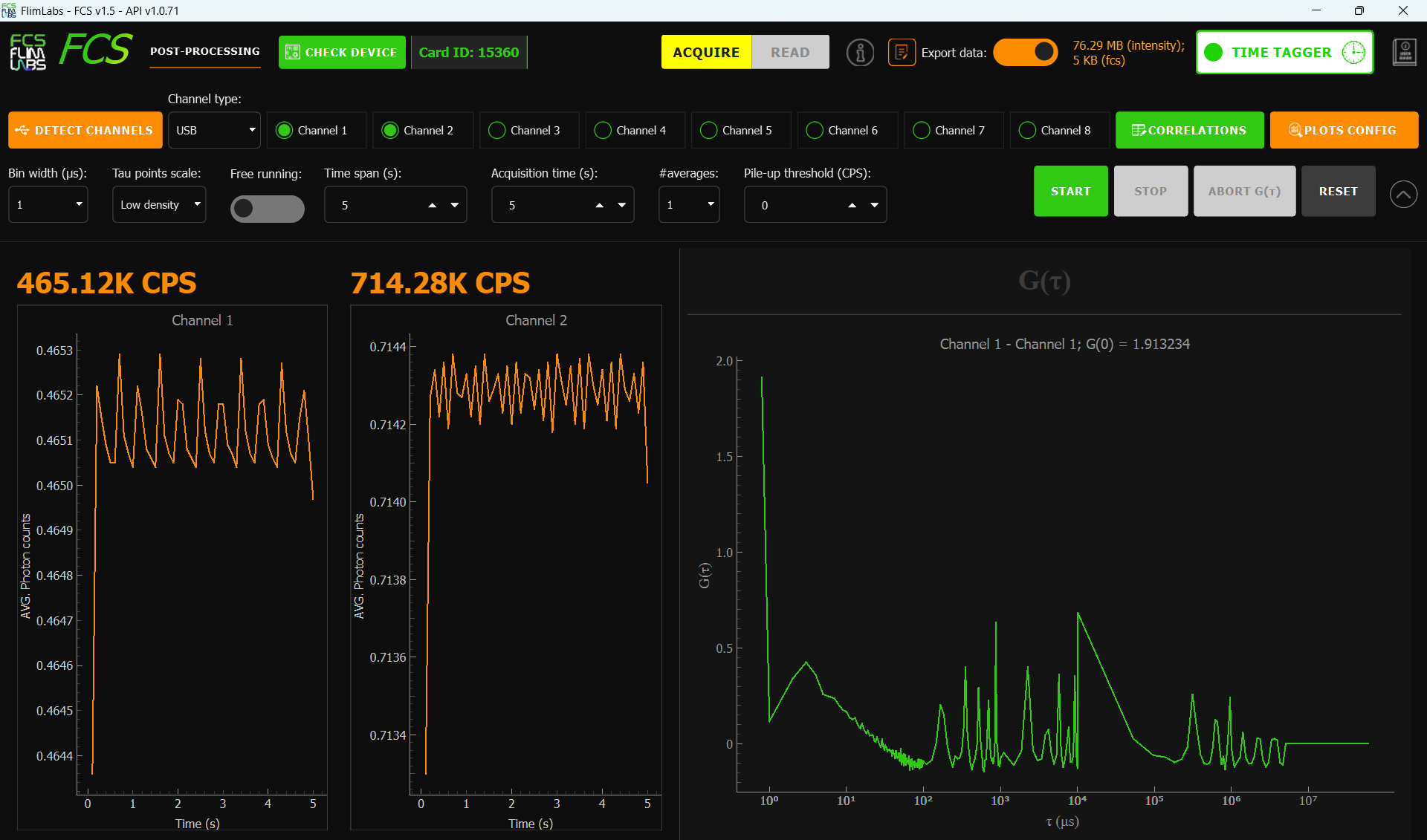 real-time acquired photon intensity data (either in plot format or showing only the CPS - average counts per second).plots related to the calculated G(τ) functions based on the set correlations. More in details: